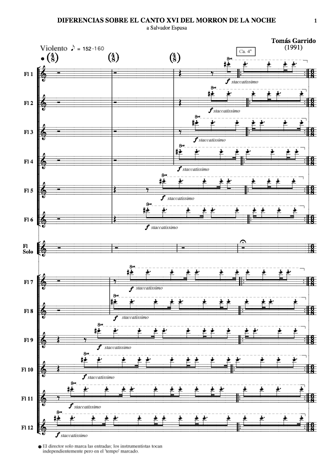 Esta obra fue compuesta entre 1990/1991 a petición de Salvador Espasa para su recién creada Orquesta de Flautas de Madrid: el planteamiento era hacer una obra similar a los conciertos solísticos del siglo XVIII (especialmente los de Mozart) en la que el solista fuera a la vez el director. Y con este punto de partida surge esta obra para Flauta solista y 12 Flautas (iguales) que utiliza como material musical otra obra mía anterior, Cantos del Morrón de la Noche (encargo también de S. Espasa para el Trío Arlequín), para realizar unas Diferencias sobre su Canto XVI siguiendo el modelo de las Diferencias renacentistas españolas con los recursos propios del género, a los que se añade el juego espacial resultante de la colocación de las flautas.