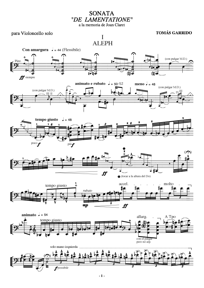 Esta obra nace como un encargo de la XLI Semana de Música Religiosa de Cuenca y Lluís Claret con el que mantengo un estrecha relación desde hace años como intérprete y compositor. Está dedicada a la memoria de su hermano Joan Claret, fallecido el pasado septiembre en Toulouse donde era profesor en la universidad, y surge como una lamentación de un no-creyente hacia otro no-creyente pero no por ello exenta de sentimiento religioso, aunque sea de otro tipo. La obra está dividida en tres movimientos: Aleph, Beth, Ghímel, que son los tres primeros números o palabras hebreas obligatorias con que comienzan las lamentaciones en la tradición hispánica que siempre han sido cantadas; en este caso ésta es sonada. Por lo demás, la obra se articula en torno a las notas que surgen del apellido Claret: do-la-re.