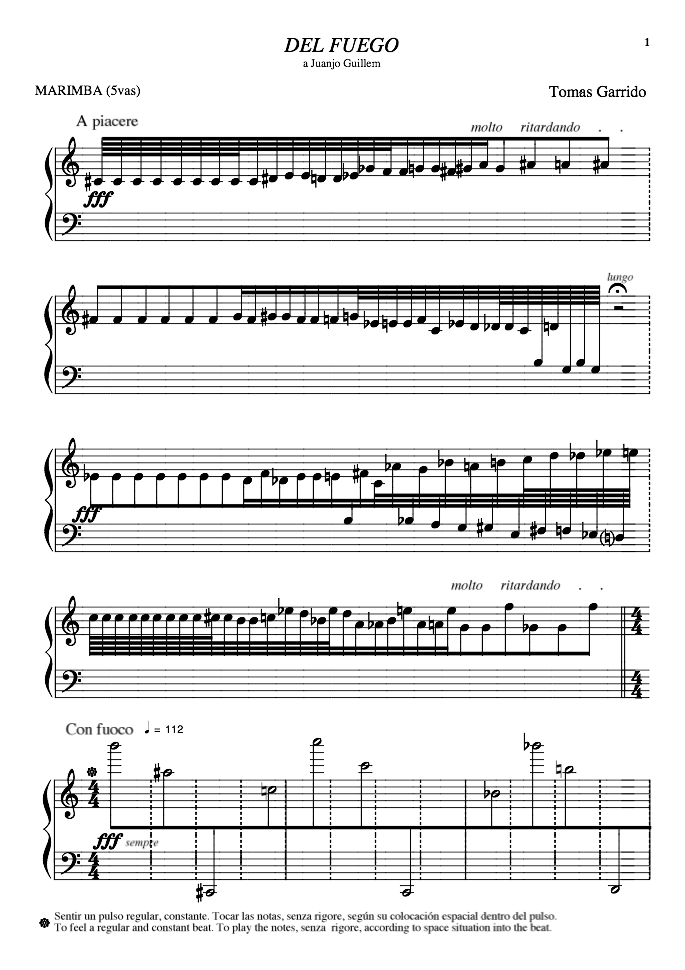 Muy diversos y atípicos instrumentos de percusión utilizó el intérprete en este montaje, pero mi participación fue requerida para componer una obra exclusivamente para Marimba de 5vas que representase al fuego.